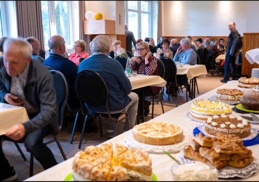 Anschließend fand im Dorfgemeinschaftshaus eine gemütliche Kaffeetafel statt, bei der hausgemachte Kuchen und Kaffee serviert wurden. Die herzliche Atmosphäre lud zum Austausch und Zurückblicken auf viele schöne Erinnerungen ein. In diesem Rahmen wurde ein weiteres plattdeutsches Gedicht ebenfalls von Clemens Saalfeld über die Grönheimer von Gerda Tellmann vorgetragen.